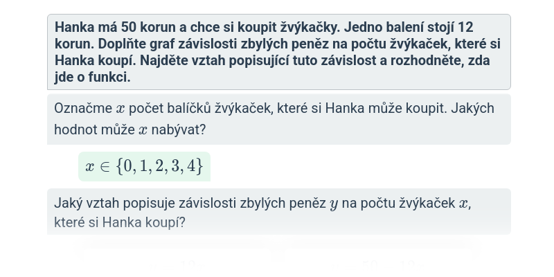 V tomto cvičení doplňujete jednotlivé kroky v rozsáhlejším postupu – například jednotlivé kroky v úpravě výrazů nebo při řešení rovnic. Cvičení je dobrou rozcvičkou na samostatné řešení kompletních příkladů.